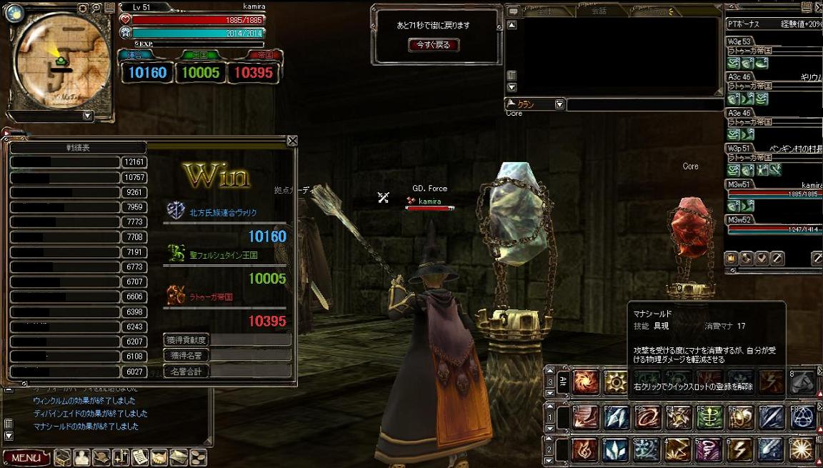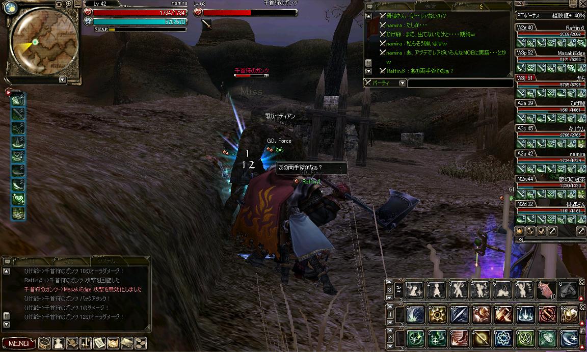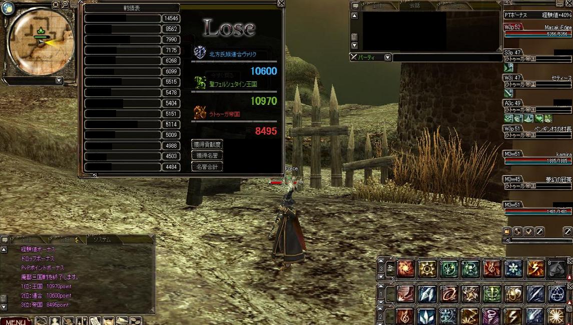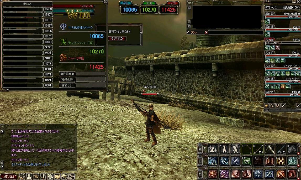 PKもなくひたすら狩りに専念できましたが、近くにいた帝国PTからPKが来たとの連絡がありましたので撤収しました。(イサミさん、ワープ感謝!^_^b)